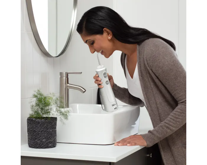 Waterpik™ Cordless Pearl is a compact, rechargeable water flosser designed for healthier gums and cleaner teeth - at home or on the go. With 2 pressure settings, 4 flossing tips (including Orthodontic and Plaque Seeker™) and enhanced 360° tip rotation, it delivers an effective, customised clean that’s perfect for everyday use, even around braces and implants.